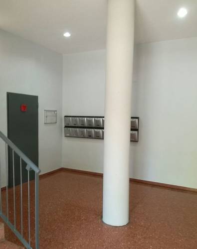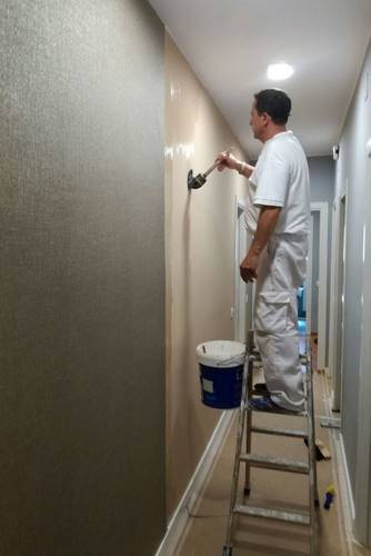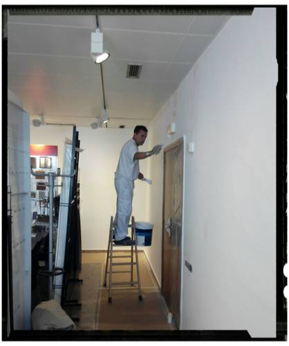 Trabajos de pintura realizados en entrada de Comunidad de Propietarios, - Tratamiento de saneado de fisuras y extracción de manchas en techos y paredes. - Masillado de fisuras y extendido de paredes con pasta para cubrir la gota existente,hasta dejar soporte liso